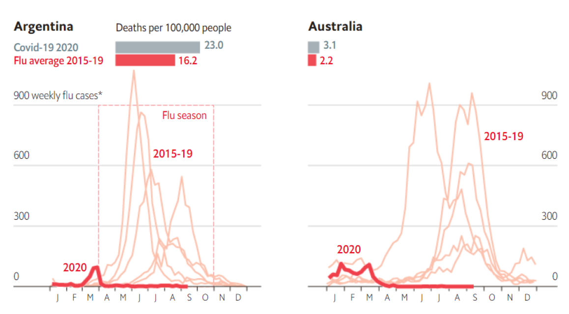 Opatření proti šíření SARS-CoV2 pravděpodobně ovlivnila v příznivém slova smyslu chřipkovou sezónu na jižní polokouli ve smyslu, že v některých zemích ani o chřipkové sezóně nelze uvažovat.