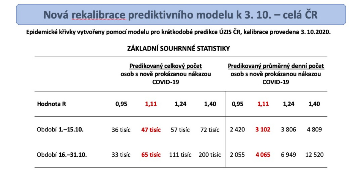 Teprve ve čtvrtek představil ředitel Ústavu zdravotnických informací a statistiky (ÚZIS) Ladislav Dušek modely prognózy vývoje šíření koronaviru v Česku a už v pátek čísla nakažených přesáhla nejhorší možnost. Oficiální prognóza vývoje epidemie předpovídala, že v první polovině října bude průměrně denně zaznamenáno 4809 nových případů, a to v rámci nejhoršího možného předpokladu, který počítal s reprodukčním číslem 1,4. V pátek bylo ovšem zaznamenáno 8 618 případů.