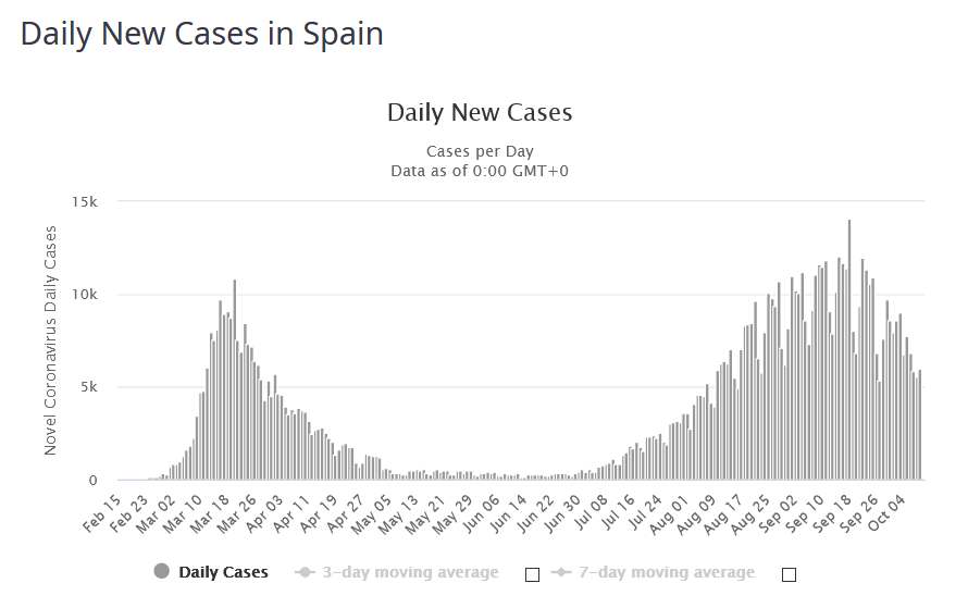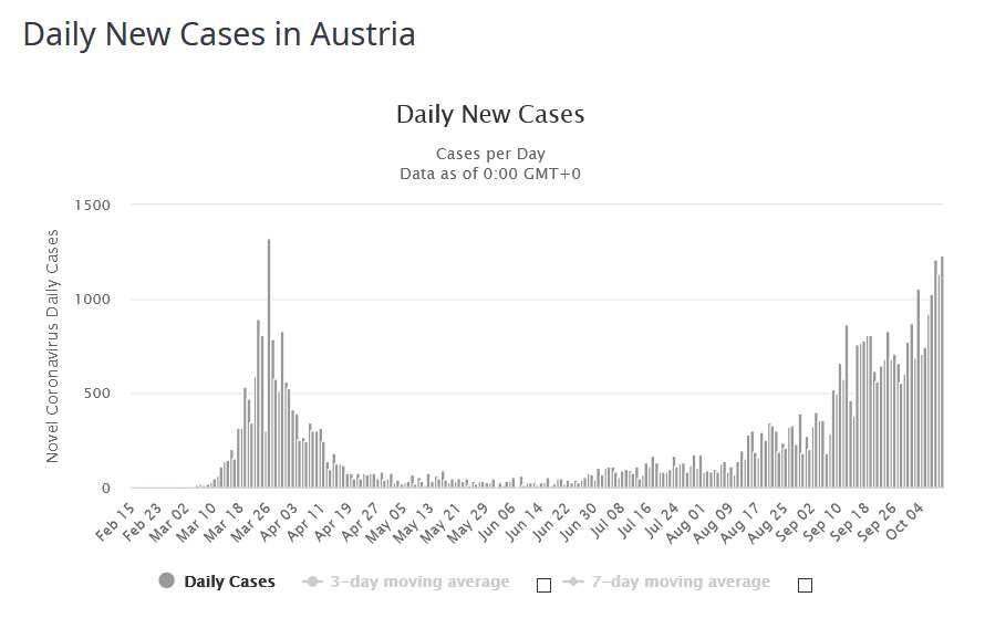 Prediktivní model vývoje epidemie v České republice. Ústav ve svém prediktivním modelu počítal v období od 1. do 15. října v nejoptimističtější variantě s průměrem 2420 nově nakažených denně. V nejhorším výhledu pak počítal s denním nárůstem 4809 potvrzených případů. Skutečný průměr je však už nyní (od 1. do 9. října) 4290 a poslední čtyři dny se nárůsty výrazně zvyšují.