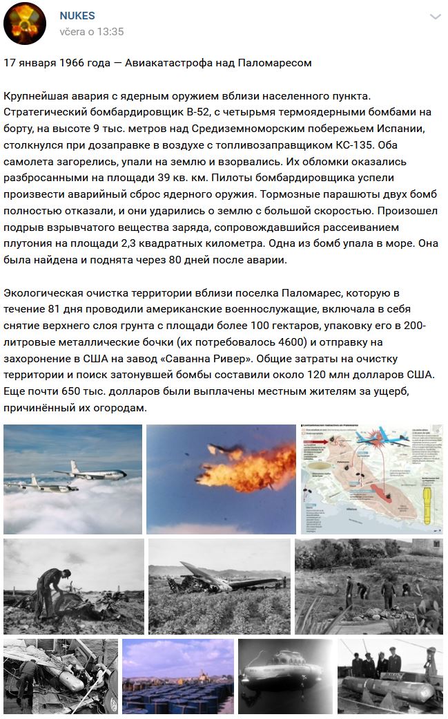 17.01.1966 = pred 55-timi rokmi vo výške 9000m nad Španielskom zrážka vo vzduchu strategického bombardéra B-52 a tankera KC-135 = B-52 mala na palube 4ks termonukleárnych bômb, pilotom sa podarilo urobiť núdzový odhod daných bômb, ale na 2 bombách brzdiace / stabilizačné padáky úplne zlyhali = plutóniom sa po dopade rozptýlilo na ploche 2,3km štvorcových. Jedna z bômb spadla do mora a bola vylovená po 80 dňoch. Celkové náklady na vyčistenie oblasti vtedy činili 120 miliónov $ + španielskym obyvateľom bolo vyplatených celkovom sumárne 650 tisíc $ ako odškodné.
