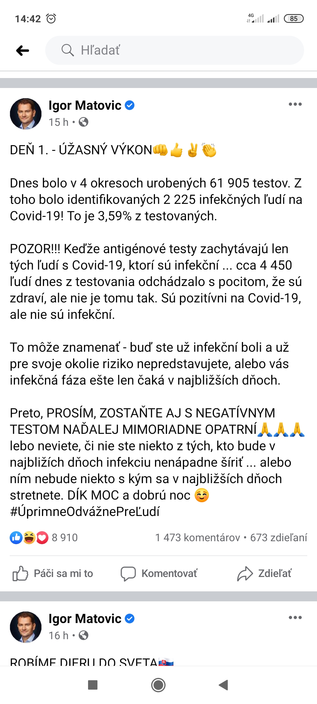 "Naď zároveň oznámil aj aktuálne čísla za dnešný deň: Do 11.00 h. dnes bolo otestovaných 21 942 ľudí, 750 z nich bolo infekčných. "Je to väčšie číslo ako v rovnakom čase včerajší deň," upozornil Naď.
