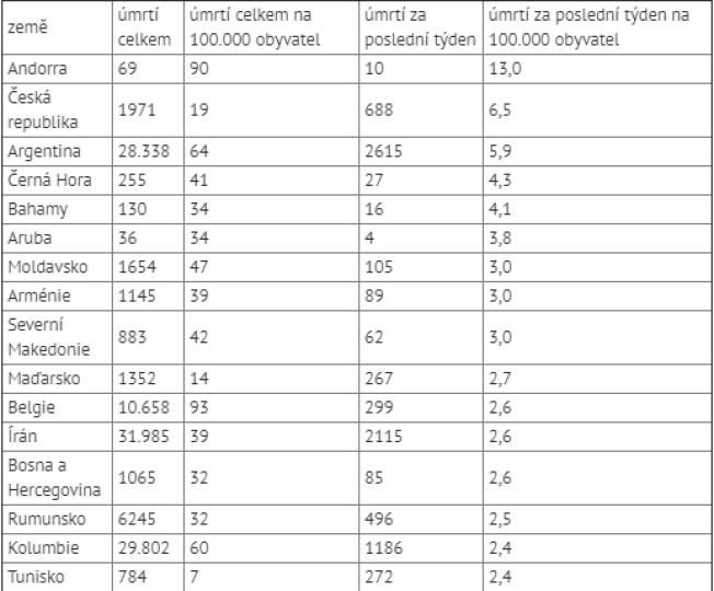 Podle údajů deníku The New York Times (NYT) je Česká republika podle počtu úmrtí na 100.000 obyvatel za uplynulý týden už na druhém místě ve světě za malou Andorou. Celkově je ČR v počtu úmrtí od začátku pandemie na 100.000 obyvatel na 46. místě (ještě minulý týden byla na 61. místě) na světě, v rámci Evropské unie pak na 11. místě (minulý týden byla na 14. místě). Nejhůře jsou na tom v EU Belgie a Španělsko.