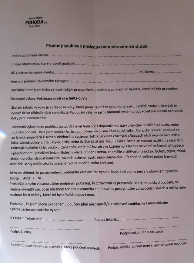 Domy seniorů už chystají písemné souhlasy s vakcinací... A klienti pod tlakem, že když odmítnou, tak je vyhodí, to podepisují... Jen by mě zajímalo odkud má ten Dům senoirů ty vedlejší účinky a které vakcíny se to týká....