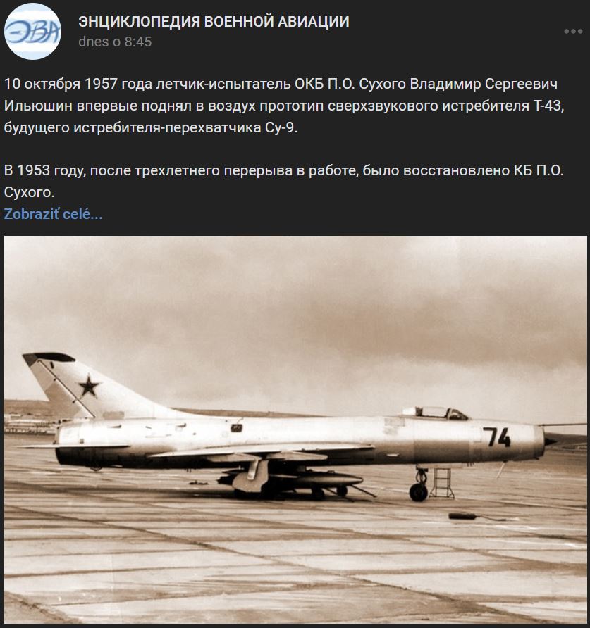 10.10.1957 = pred 65-timi rokmi vzlietol skúšobný pilot OKB Suchoj Vladimir Sergejevič Iľjušin (Владимир Сергеевич Ильюшин) s prvým prototypom nadzvukovej stíhačky T-43, budúceho stíhacieho lietadla Su-9 (Су-9)