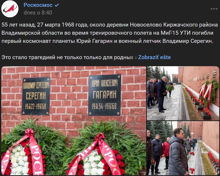 27.03.1968 = pred 55-timi rokmi, pri obci Novoselovo (Новоселово) v Kiržačskom okrese vo Vladimírskej oblasti zahynul počas cvičného letu na lietadle MiG-15UTI (МиГ-15УТИ) prvý kozmonaut planéty Jurij Gagarin (Юрий Гагарин) a vojenský pilot Vladimir Seregin (Владимир Серегин). Bola to tragédia nielen pre rodinu a priateľov prvého kozmonauta, ale aj osobný smútok pre každú rodinu v Sovietskom zväze. V krajine zavládol štátny smútok. Jurij Gagarin a Vladimir Seregin sú muži hrdinského povolania. Ich životy sú príkladom na nasledovanie a ich stopy zostanú navždy na Zemi a vo vesmíre. Delegácia Roskosmosu vedená generálnym riaditeľom Jurijom Borisovom dnes položila kvety k pamätníku pri kremeľskom múre na Červenom námestí.