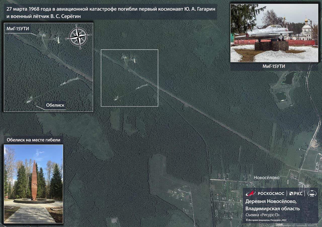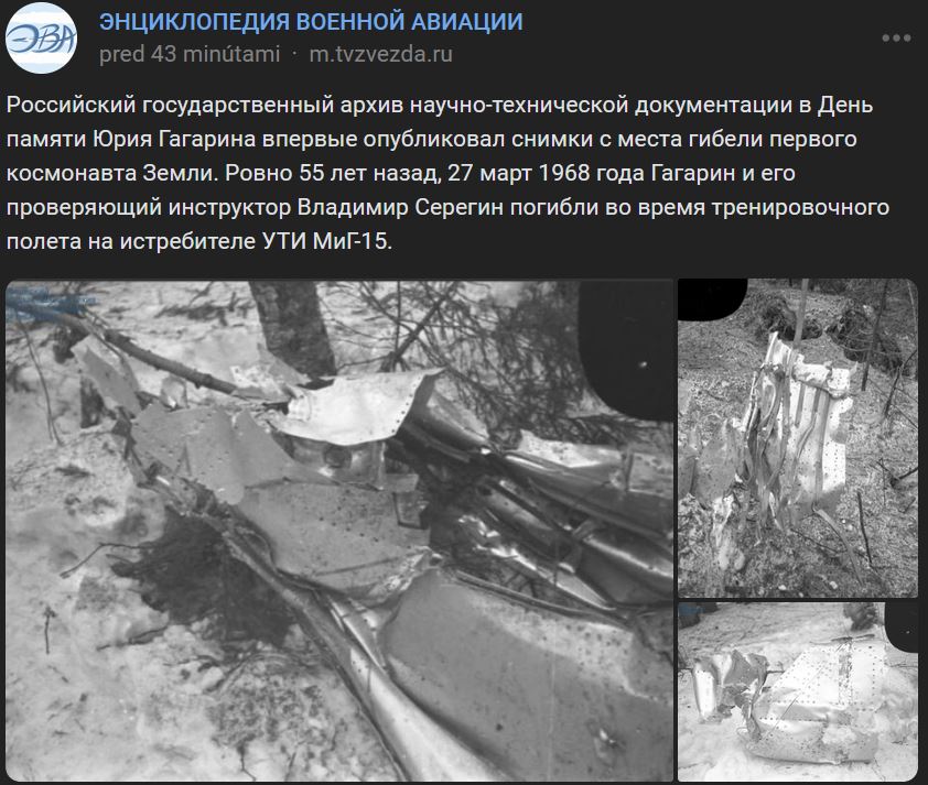 Ruský štátny archív vedeckej a technickej dokumentácie pri príležitosti pamätného dňa Jurija Gagarina po prvýkrát zverejnil zábery z miesta smrti prvého kozmonauta na Zemi. Presne pred 55 rokmi, 27.03.1968, Gagarin a jeho kontrolný inštruktor Vladimir Seregin zahynuli počas cvičného letu na stíhačke MiG-15UTI. Zdroj https://vk.com/wall-173678697_318826 z 27.03.2023 + 3 kvalitnejšie fotografie