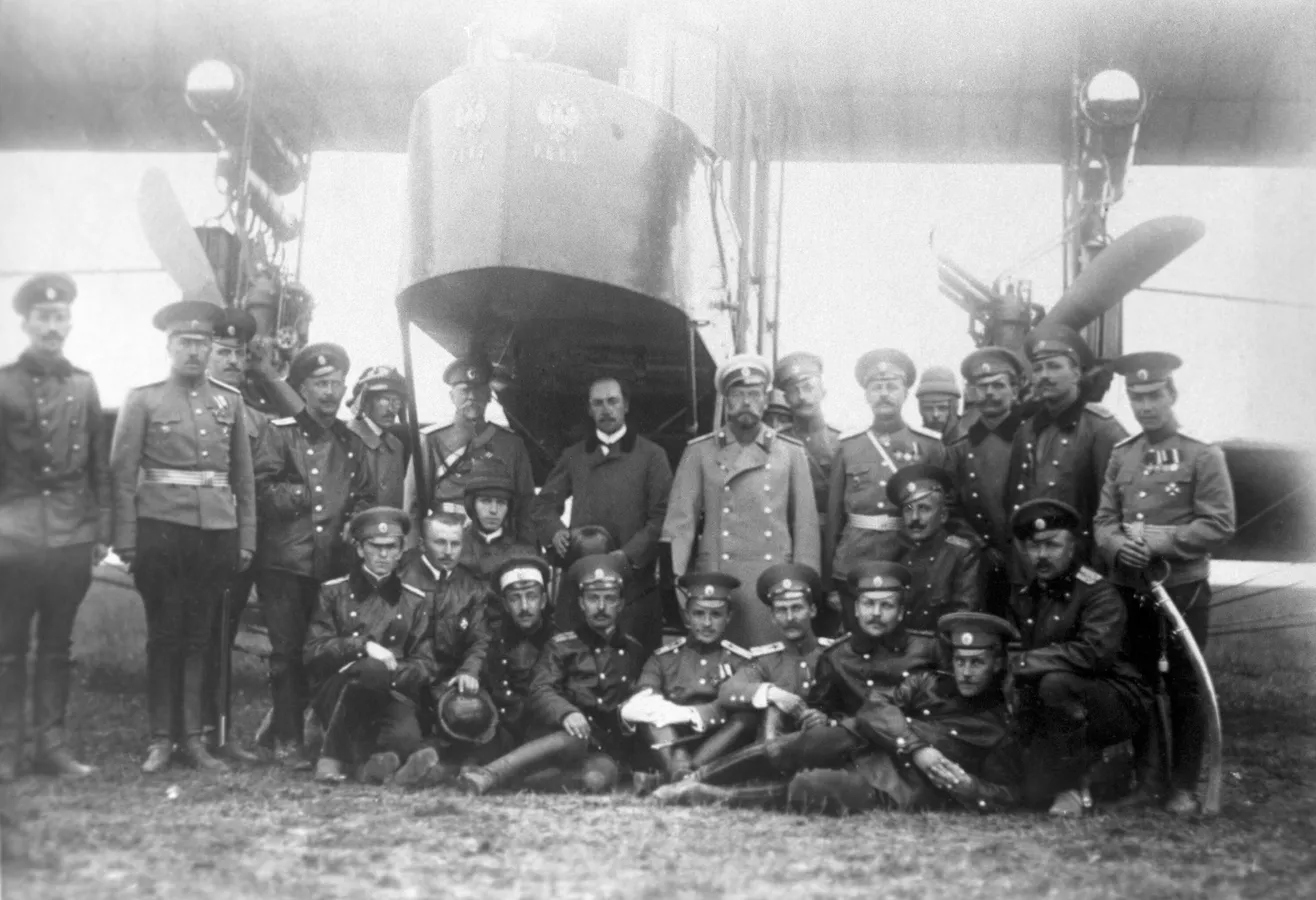 Ruský cisár Mikuláš II (druhý rad, piaty sprava) pri lietadle Ruský Víťaz. 1913