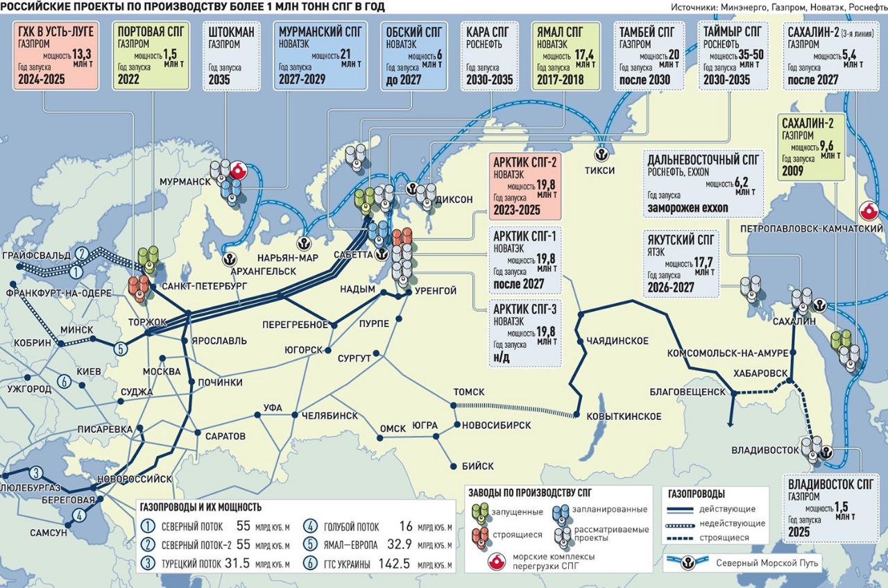 Rusko, aktuálna a aj plánovaná sieť plynovodov a SPG (СПГ)/LNG terminálov s ich kapacitou