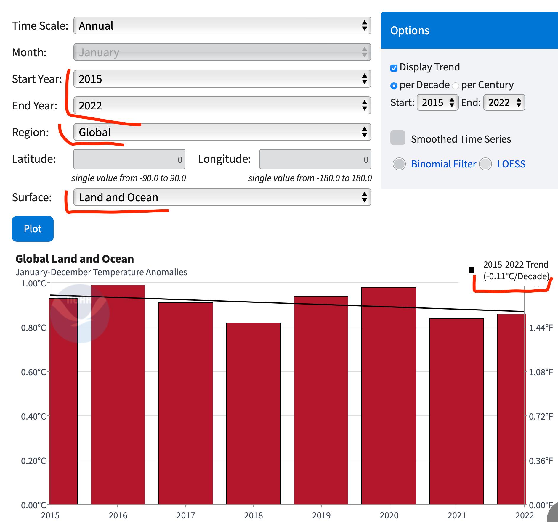 Například průměrná teplota na celé zeměkouli včetně oceánů za posledních sedm let klesala. Trend od roku 2015 do roku 2022 je podle NOAA pokles o 0,11 stupně za dekádu. Graf vypadá takto: V případě, že by graf zahrnoval léta 2013 až 2022, vyjde naopak trend nárůstu teplot o 0,15 stupně za dekádu. Důvod je jednoduchý. V letech 2015 a 2016 průměrná teplota vzrostla o 0,2 stupně oproti předchozím letům. Od roku 2016 nerostla, ale spíše klesala.