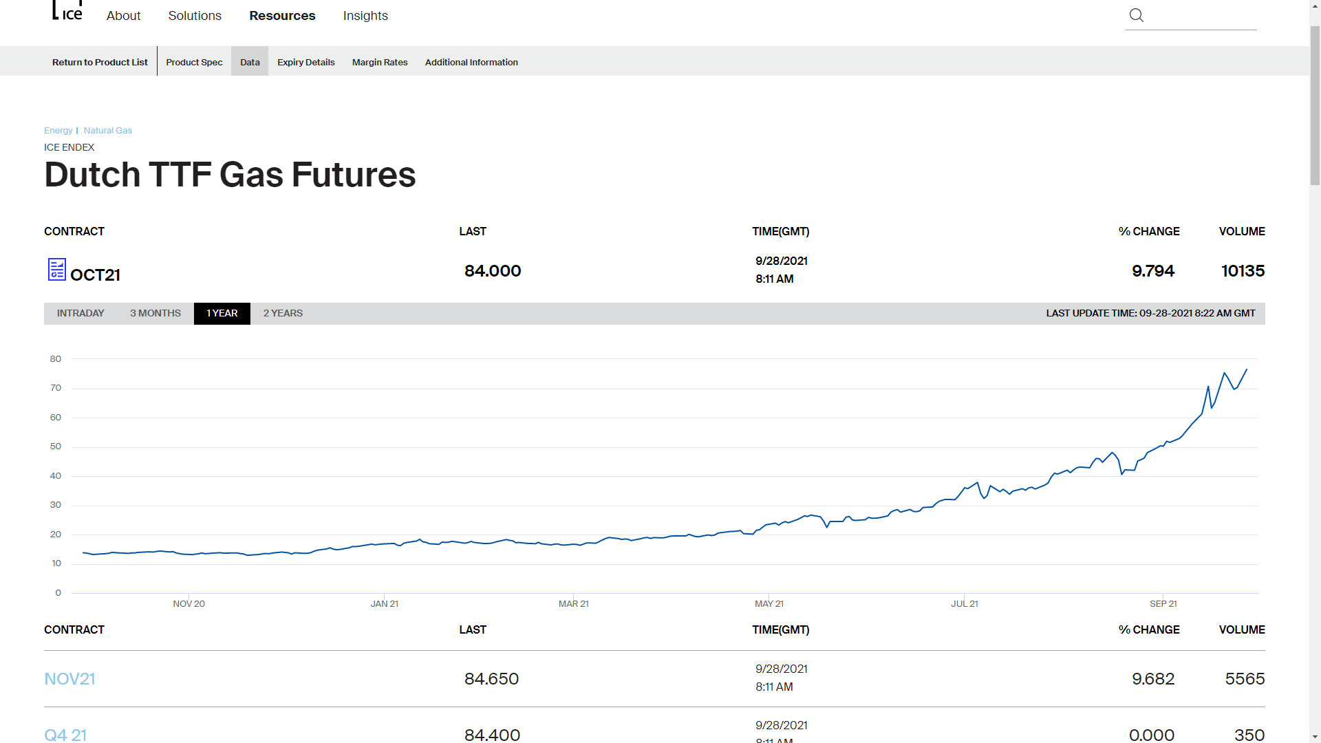 Ceny plynu v Evropě 28. září poprvé v historii překročily hranici 1 000 USD za tisíc metrů krychlových, maximální hodnota v aukci byla 1 057,18 USD za tisíc metrů krychlových.