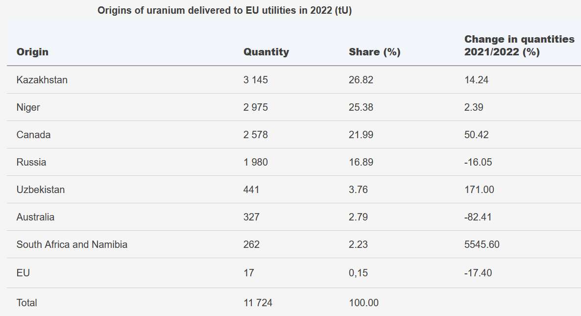 Jak uvádí na svém webu jaderné sdružení Euratom, celkem 91 procent uranu dovezeného do zemí Evropské unie loni pocházelo ze čtyř zemí – Kazachstánu, Nigeru, Kanady a Ruska. Dovozní závislost je přitom skoro stoprocentní. Na území EU se vyprodukovalo pouhých 17 tun uranu, což představuje zanedbatelný podíl v celkové spotřebě ve výši 11 724 tun.