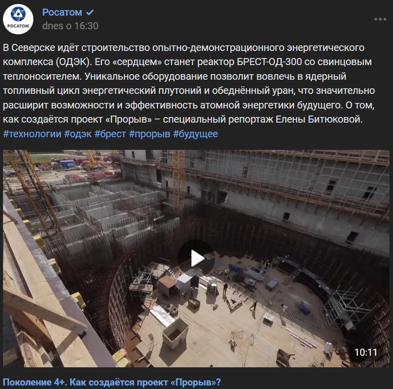 Pri meste Seversk (Северск) sa buduje experimentálny demonštračný energetický komplex (ODEK/ОДЭК). Jeho "srdcom" bude reaktor BREST-OD-300 (БРЕСТ-ОД-300) s oloveným chladivom. Unikátne zariadenie umožní zapojiť do jadrového palivového cyklu energetické plutónium a ochudobnený urán, čo výrazne rozšíri možnosti a účinnosť jadrovej energetiky budúcnosti. O tom, ako vzniká projekt Proryv (Прорыв) - špeciálna reportáž Eleny Bitjukovej (Елены Битюковой).
