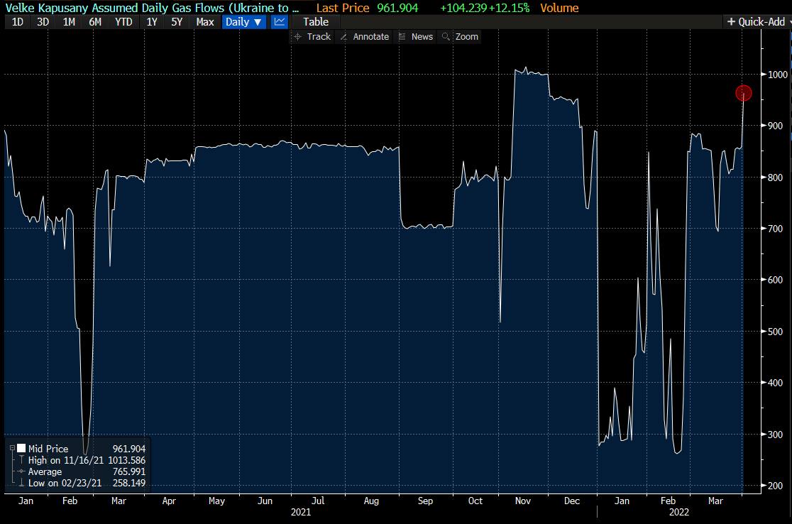 "Gazprom" dodáva ruský plyn na tranzit cez územie Ukrajiny v bežnom režime v súlade s požiadavkami európskych spotrebiteľov - 79,6 milióna metrov kubických k 10.04.2022“ povedal Sergej Kuprijanov (Сергей Куприянов). Tento objem je nižší ako dodávky v rámci dlhodobých rezervácií na tranzit plynu cez Ukrajinu (asi 109,5 milióna metrov kubických denne). V sobotu 09.04.2022 žiadosti predstavovali 78,3 milióna metrov kubických. Európa v poslednom čase výrazne zvýšila nákupy plynu z Ruska na pozadí rastúcich spotových cien v dôsledku chladného počasia, bezvetria a tiež z dôvodu zhoršenia situácie na Ukrajine.