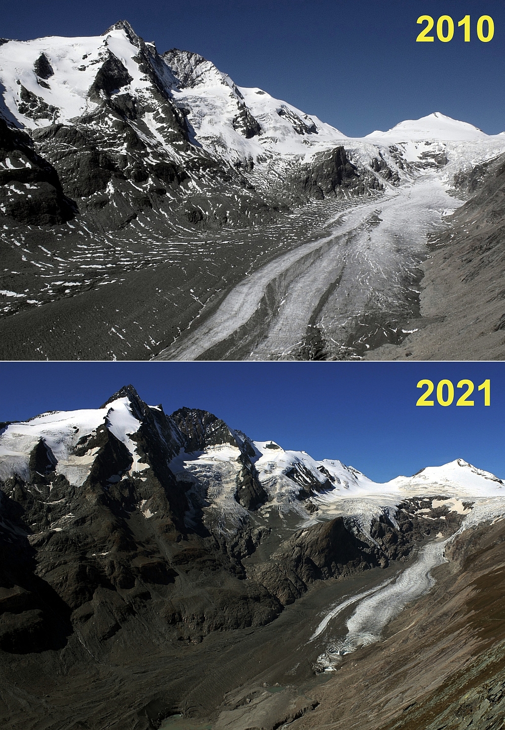 Jedno zajímavé srovnání - dvě fota, pořízené z více-méně stejného místa s odstupem 11 let. Großglockner a ledovec v jeho údolí. Těžko odsud odhadnout, kolik ho ubylo, ale je to pěkných pár metrů...