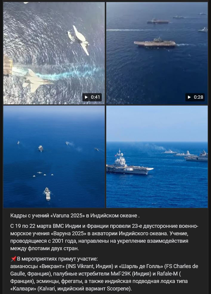 Video 1 https://vk.com/video-123538639_456315432 dĺžka 41 sek.V dňoch 19.03.- 22.03.2025 VMS Indie a Francúzska uskutočnili 23. bilaterálne námorné cvičenie „Varuna 2025“ v Indickom oceáne. Cieľom cvičenia, ktoré sa koná od roku 2001, je posilniť vzájomnú spoluprácu medzi námornými silami oboch krajín.