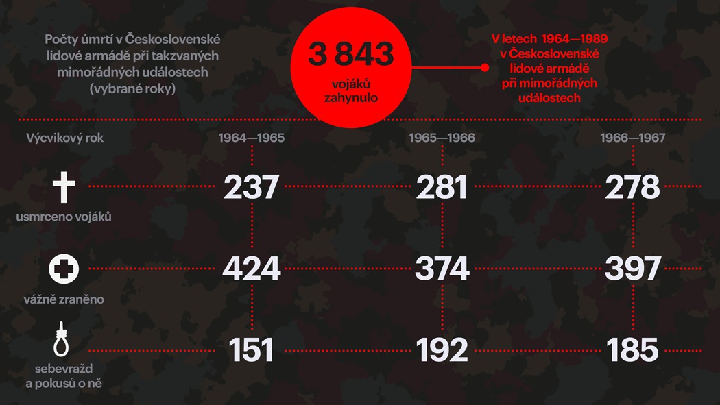 Například jen ve výcvikovém roce 1966/67 zahynulo při výkonu vojenské služby nebo v souvislosti s ní 278 vojáků, dalších 397 utrpělo těžké zranění. Nešlo přitom o žádnou výjimku. „Od počátku šedesátých let se počet úmrtí v armádě pohyboval přes dvě stovky ročně prakticky každý rok,,“ řekl INFO.CZ historik Prokop Tomek z Vojenského historického ústavu.