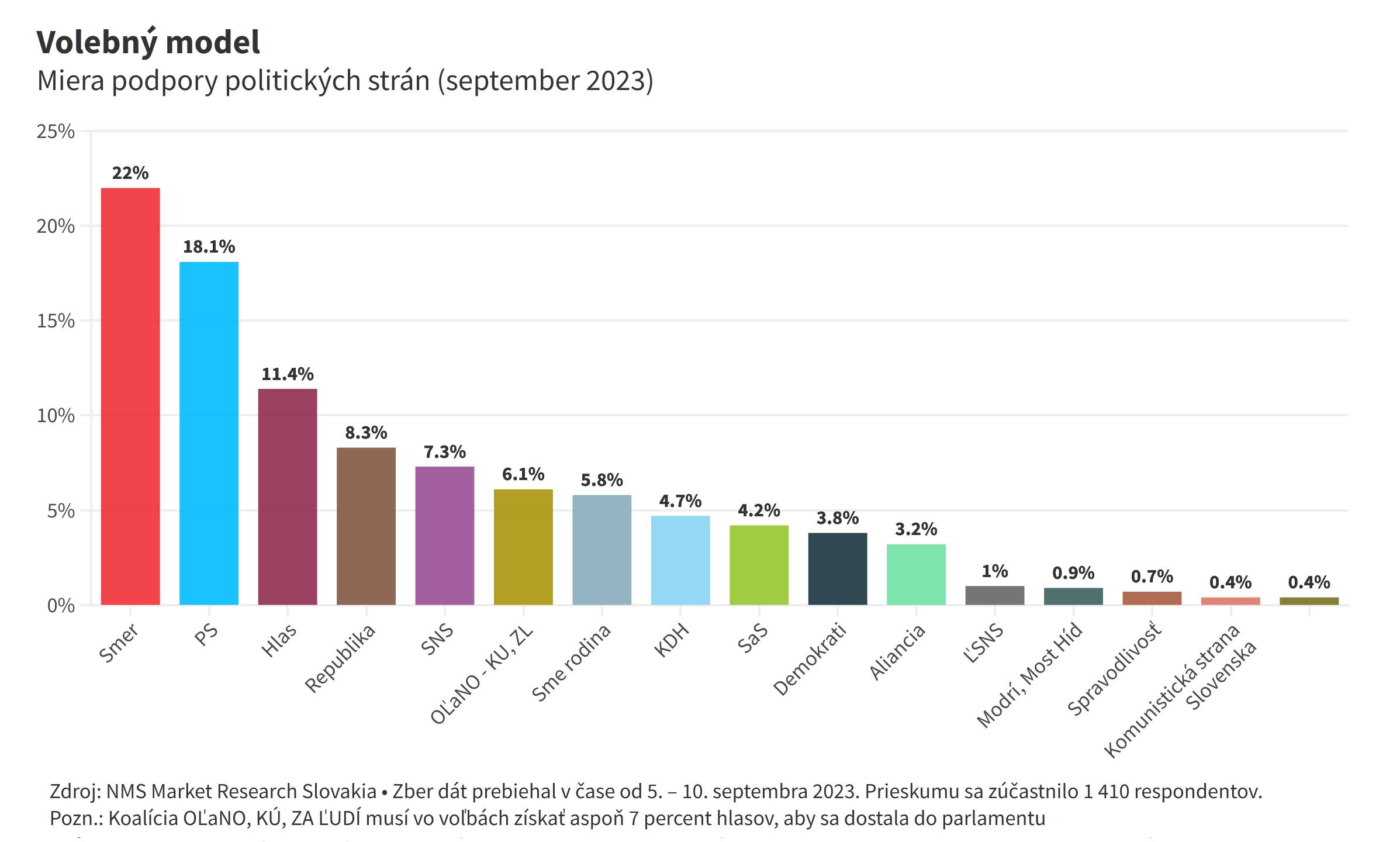V najnovšom prieskume agentúry NMS Market Research pre denník Sme by voľby vyhral Smer, ktorý dosiahol 22 percent. Na druhom mieste je Progresívne Slovensko (18,1 percenta) a tretí je Hlas (11,4 percenta).