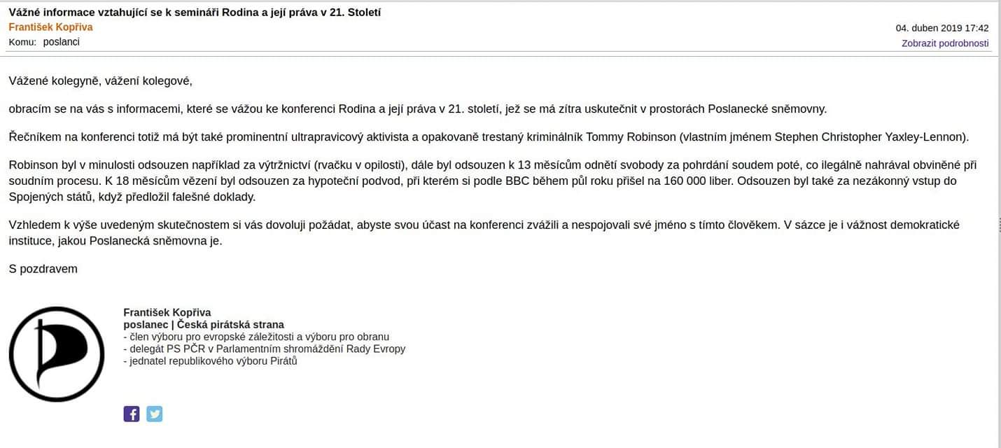 Poslanec Milan Pour (ANO) po kritice zrušil páteční konferenci Rodina a její práva v 21. století ve Sněmovně. Měl na ní vystoupit britský krajně pravicový aktivista Tommy Robinson, který byl několikrát trestaný za napadení, podvody či pohrdání soudem. Pour uvedl, že si o řečnících nezjistil podrobné informace. Jeho prohlášení ČTK zaslala mluvčí ANO Lucie Kubovičová. Robinsonovu účast na konferenci v dolní komoře kritizoval například britský velvyslanec v Česku Nick Archer. Od konference se distancovalo i hnutí ANO.