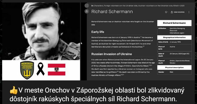 Zdroj https://t.me/spravy_slovakia/12461 z 28.01.2024V meste Orechov v Záporožskej oblasti bol zlikvidovaný dôstojník rakúskych špeciálnych síl Richard Schermann