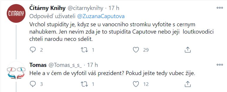 Reakci vzbudila i samotná fotografie prezidentky s černou textilní rouškou. „Vrchol stupidity je, když se u vánočního stromku vyfotíte s černým náhubkem. Jen nevím, zda je to stupidita Čaputové nebo její loutkovodiči chtěli národu něco sdělit,“ sneslo se dále v komentářích na Twitteru.Ta slovenština je tak krásnej a světovej jazyk. Ani jsem netušil, že se slovensky veselé Vánoce řekne Merry Christmas.