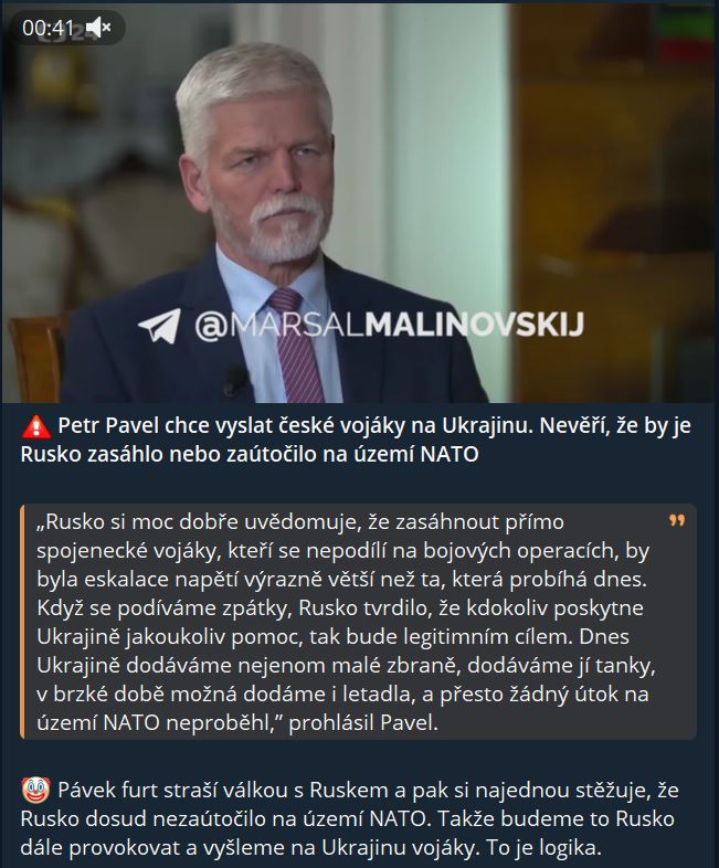 Zdroj https://t.me/marsalMalinovskij/5581 z 10.03.2024„Rusko si moc dobře uvědomuje, že zasáhnout přímo spojenecké vojáky, kteří se nepodílí na bojových operacích, by byla eskalace napětí výrazně větší než ta, která probíhá dnes. Když se podíváme zpátky, Rusko tvrdilo, že kdokoliv poskytne Ukrajině jakoukoliv pomoc, tak bude legitimním cílem. Dnes Ukrajině dodáváme nejenom malé zbraně, dodáváme jí tanky, v brzké době možná dodáme i letadla, a přesto žádný útok na území NATO neproběhl,” prohlásil Pavel.
