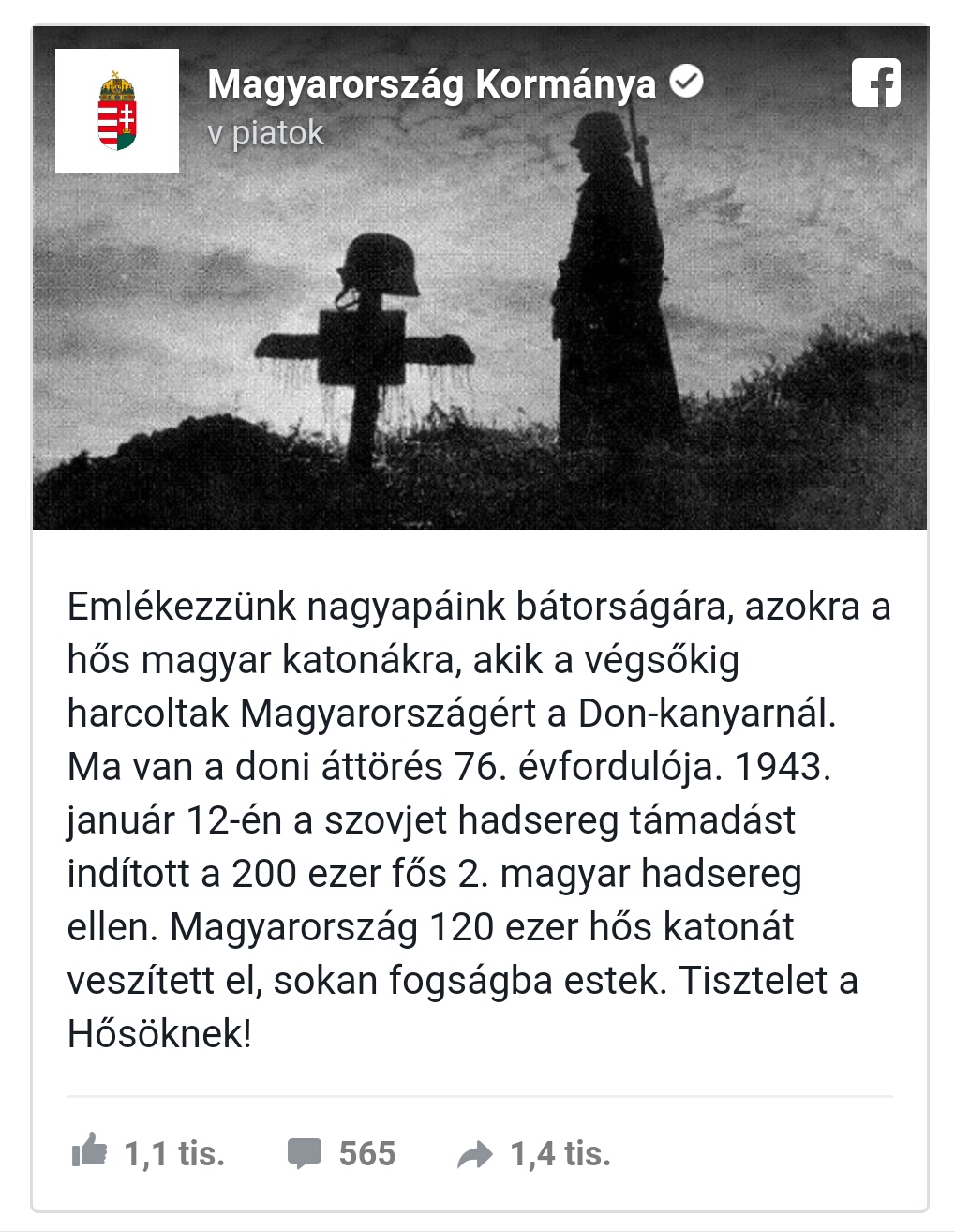 Administrator na webe madarskej vlady napisal, ze si treba pripomenut padlych hrdinov z roku 1943, ktori bojovali "za Madarsko na Done".