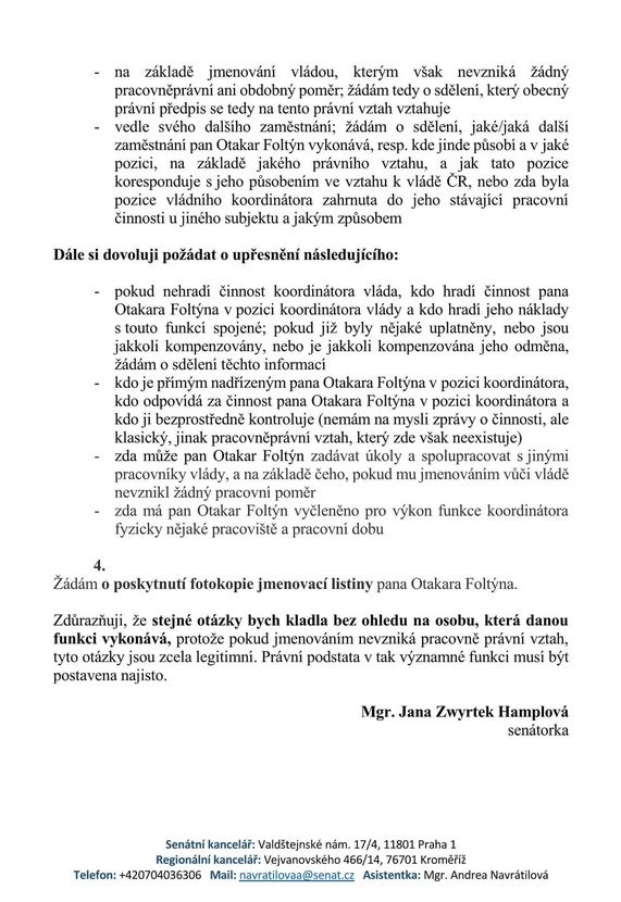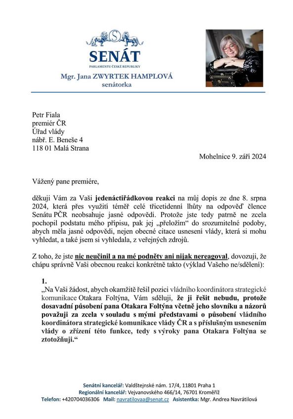 Senátorka Jana Zwyrtek Hamplová se pustila do řeči s premiérem Petrem Fialou (ODS). Obrátila se na něj úředním dopisem. Fialovi úředníci jí toho prý moc neřekli a senátorka si kvůli tomu z nich tropila žerty. Ale jednu důležitou věc se prý přece jen dozvěděla. O plukovníku Foltýnovi.