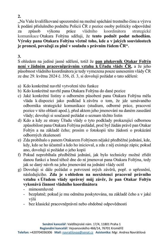 Pro Úřad vlády Foltýn nepracuje. Tak pro koho? Senátorka Hamplová páčí z Fialy odpověď