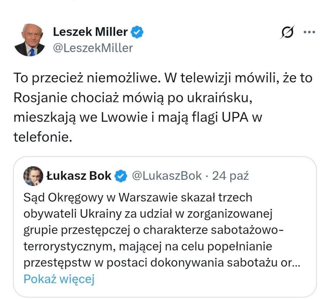 "To je přece nemožné. V televizi říkali, že jsou Rusové, ačkoli mluví ukrajinsky, žijí ve Lvově a na telefonech mají vlajky UPA" Leszek Miller