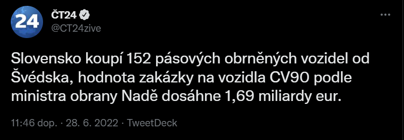 https://www.novinky.cz/zahranicni/evrop ... n-40401524Slovensko posuzovalo nabídky od Maďarska, Švédska, Španělska a Polska. Ve prospěch švédské nabídky rozhodla nejvýhodnější cena, integrovaná logistická podpora, provozní náklady, splnění technických požadavků a procento zapojení slovenského obranného průmyslu.