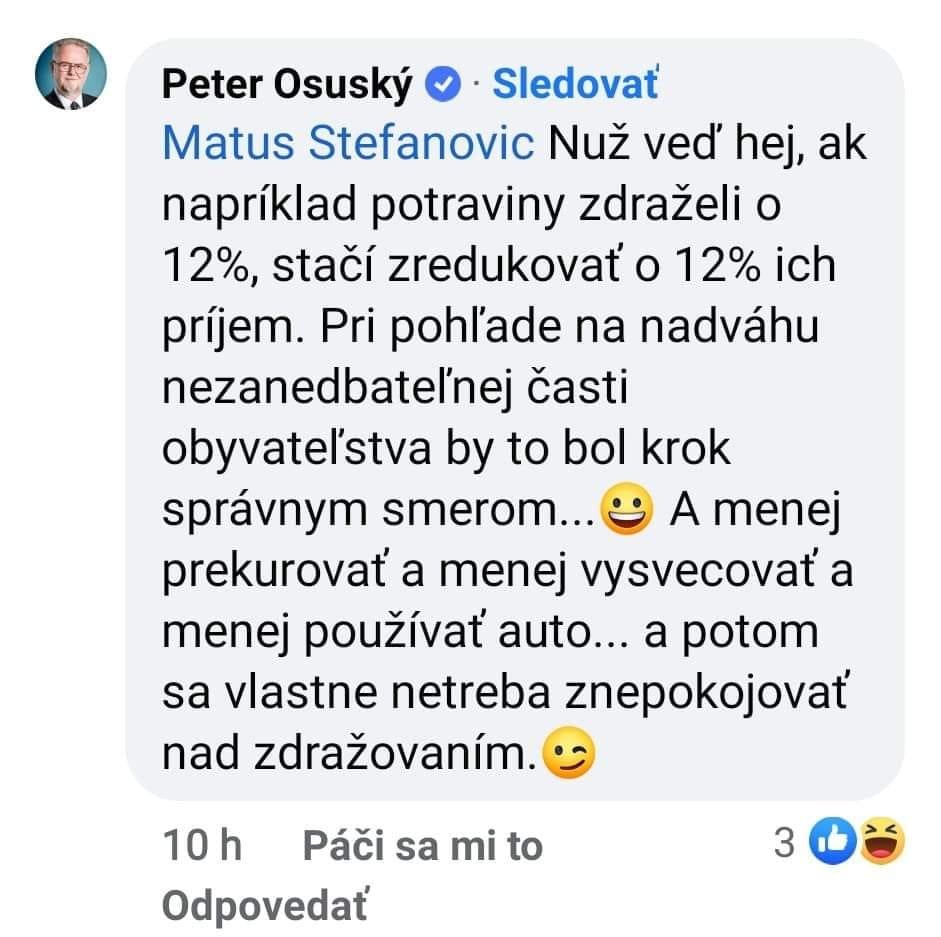 nielen v polsku koli inflacii vlada odporuca menej jest. Na Slovensku pan poslanec Kremsky odporuca odstahovat sa do mensieho bytu, pokial nezvladate vyssie vydavky na energie. Pan poslanec Osusky tiez v inflacii nevidi problem, skor naopak, impulz zdravsie zit... Drobny problem je len to, ze vacsina obyvatelstva zacina na startovacej ciare ktora je pre tychto "poradcov" uz davno za cielovou paskou