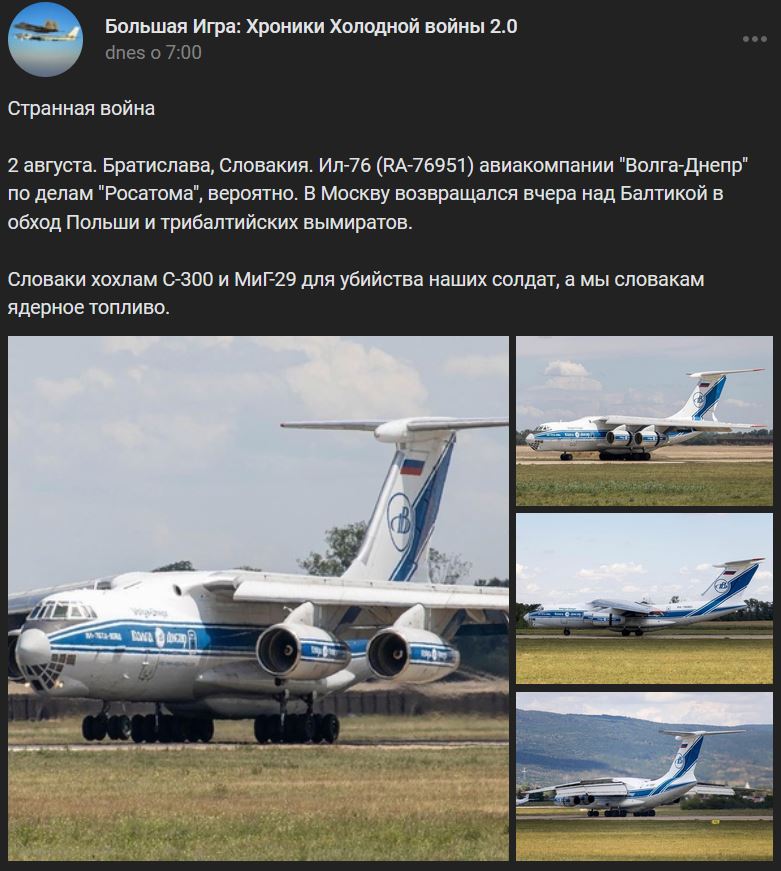 Utorok 02.08.2022?, Bratislava, Slovensko. Lietadlo IL-76 (Ил-76), registrácia RA-76951 leteckej spoločnosti Volga-Dnepr (Волга-Днепр), pravdepodobne na objednávku spoločnosti Rosatom (Росатом). Do Moskvy sa vrátil včera 04.08.2022 cez Baltské more, pričom obletel Poľsko a Pobaltské štáty.