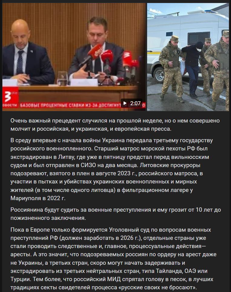 V stredu 29.10.2025 Ukrajina po prvýkrát od začiatku vojny odovzdala ruského vojnového zajatca tretej krajine. Starší námorník námornej pechoty RF bol vydaný do Litvy, kde už v piatok 31.10.2025 stanul pred vilniusským súdom a bol poslaný do vyšetrovacej väzby na 2 mesiace. Litovskí prokurátori podozrievajú ruského námorníka, zajatého v 08/2023, z účasti na mučení a vraždení ukrajinských vojnových zajatcov a civilistov (vrátane jedného Litovčana) vo filtračnom tábore pri Mariupoli v roku 2022.