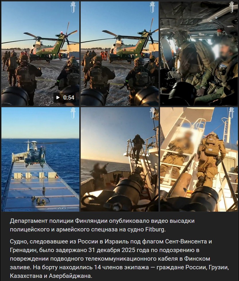 Fínska polícia 31.12.2025 zadržala 132-metrovú nákladnú loď Fitburg na ceste z ruského Petrohradu do izraelskej Haify. Loď plaviaca sa pod vlajkou karibskej krajiny Svätý Vincent a Grenadíny prevážala ruské oceliarske výrobky, ktoré podliehajú sankciám. Podľa vyšetrovania je posádka podozrivá, že kotvou lode poškodila podmorský kábel, a úrady incident vyšetrujú ako „závažný trestný čin, pokus o závažný trestný čin a závažné poškodenie telekomunikácií“.