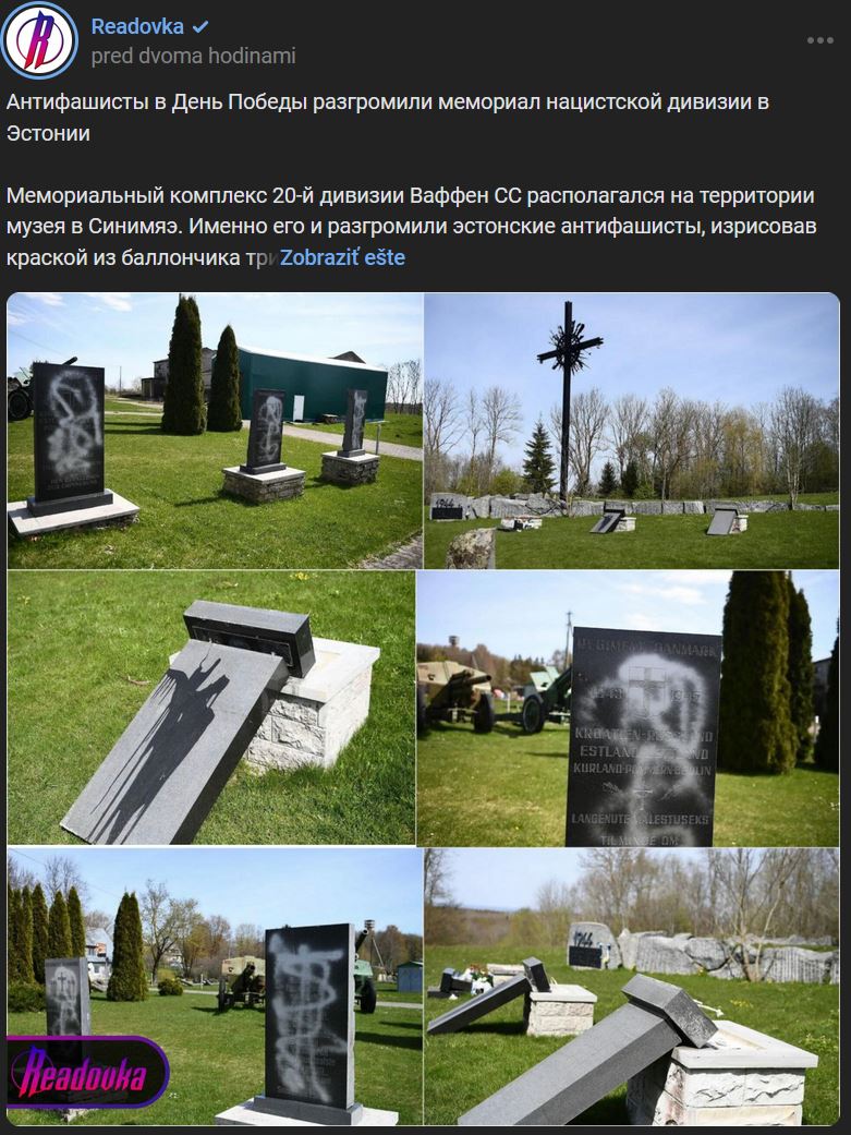 Pamätník 20. divízie Waffen SS sa nachádzal v areáli múzea v Sinimäe. Estónski antifašisti ho zdemolovali a postriekali sprejom 3 náhrobné kamene postavené na počesť estónskych nacistov na kopci Grenadier (Гренадерской горке). A na ceste Tallinn - Narva v Sinimäe dokonca prevrátili pamätník nacistom a okrem iného ho pomazali farbou. Informovali o tom miestni estónski spravodajcovia.