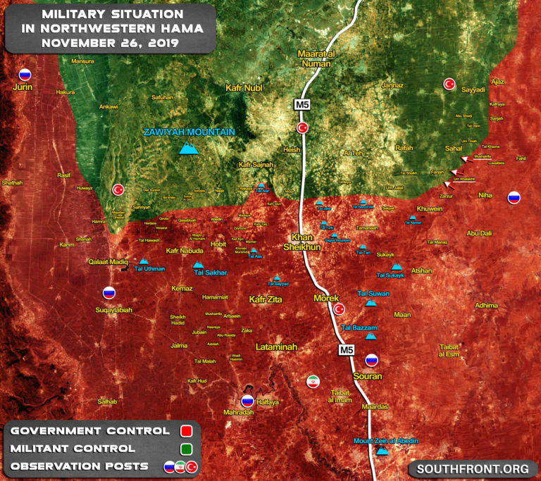 Dělostřelectvo Syrské arabské armády (SAA) bombardovalo 23. listopadu teroristické pozice a opevnění v jižním Idlibu. Podle Syrské observatoře pro lidská práva (SOHR) se útoky zaměřily na města Rakaya Sijneh a na kopec al-Nar. Britská monitorovací skupina uvedla, že během střelby létaly nad oběma oblastmi drony. Vojáci SAA také zaměřili na opevněné postavení v jižním Idlibu protitankovou řízenou střelou (ATGM). Výsledkem bylo zabití nejméně dvou radikálních bojovníků.