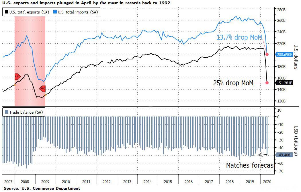 Export z USA se v dubnu propadl nejníže za deset let. Schodek zahraničního obchodu se pak prohloubil ve srovnání s předchozím měsícem o 16,7 procenta na 49,4 miliardy USD (1,17 bilionu Kč). Byl tak nejvyšší za osm měsíců. (ČTK)