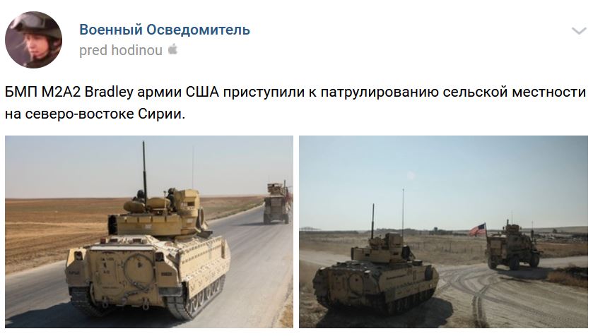 "Ústřední velení USA nařídilo řadu akcí na severovýchodě Sýrie, aby pomohlo zajistit bezpečnost a ochranu koaličních sil." USA nasadily radar Sentinel, zvýšily frekvenci amerických stíhacích hlídek nad americkými silami a nasadily bojová vozidla Bradley za účelem posílení amerických sil v bezpečnostní oblasti východní Sýrie (ESSA). Tyto akce jsou jasnou ukázkou odhodlání USA bránit koaliční síly v ESSA a zajistit to, aby byly schopny pokračovat ve své misi Defeat-ISIS. Kombinovaná Joint Task Force-Operation Inherent Resolve severovýchodní Sýrii má zajistit ochranu našich sil a pokračování mise Defeat-Daesh. Podle těchto cílů ministerstvo obrany dříve již nasadilo Bradley do severovýchodní Sýrie.