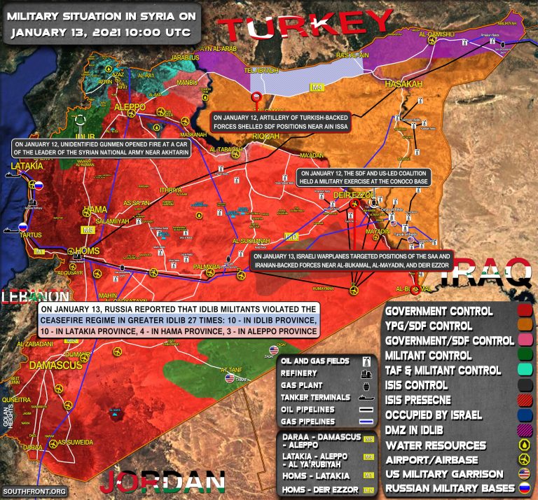 13. januára Rusko informovalo, že militanti Idlibu porušili režim prímeria vo Veľkom Idlibe 27-krát: 10 - v provincii Idlib, 10 - v provincii Latakia, 4 - v provincii Hamá, 3 - v provincii Aleppo.