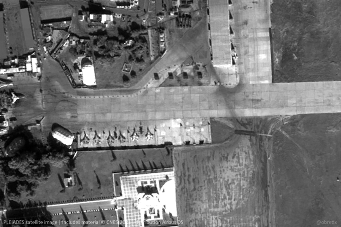 Satelitné snímky, ktoré zverejnil pozorovateľ obrany Obretix 15. januára, ukazujú najmenej šesť Mig-29 v západnej časti ruskej leteckej základne. Zábery vznikli 12. januára.