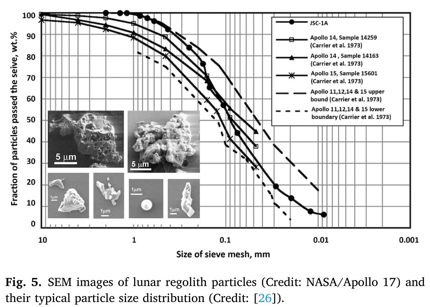 Mesačný regolit - výsledok preosievania na sitách (zvislo "prepadnutý podiel" v hmotnostných percentách, vodorovne veľkosť ok siete, značky zrejme označujú sito použité pri danej vzorke)