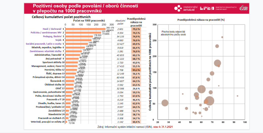 V práci často chytili nemoc covid-19 záchranáři, policisté, učitelé a sociální pracovníci. Velký podíl nakažených je také v administrativě. Největší absolutní počet nakažených je v průmyslové výrobě, ale podíl nakažených ve výrobě na celkovém počtu pracovníků je výrazně nižší než ve výše zmíněných oborech. Vyplývá to ze statistik Ústavu zdravotnických informací a statistiky (ÚZIS) ke konci ledna. Upozornil na ně na twitteru sociolog Daniel Prokop.