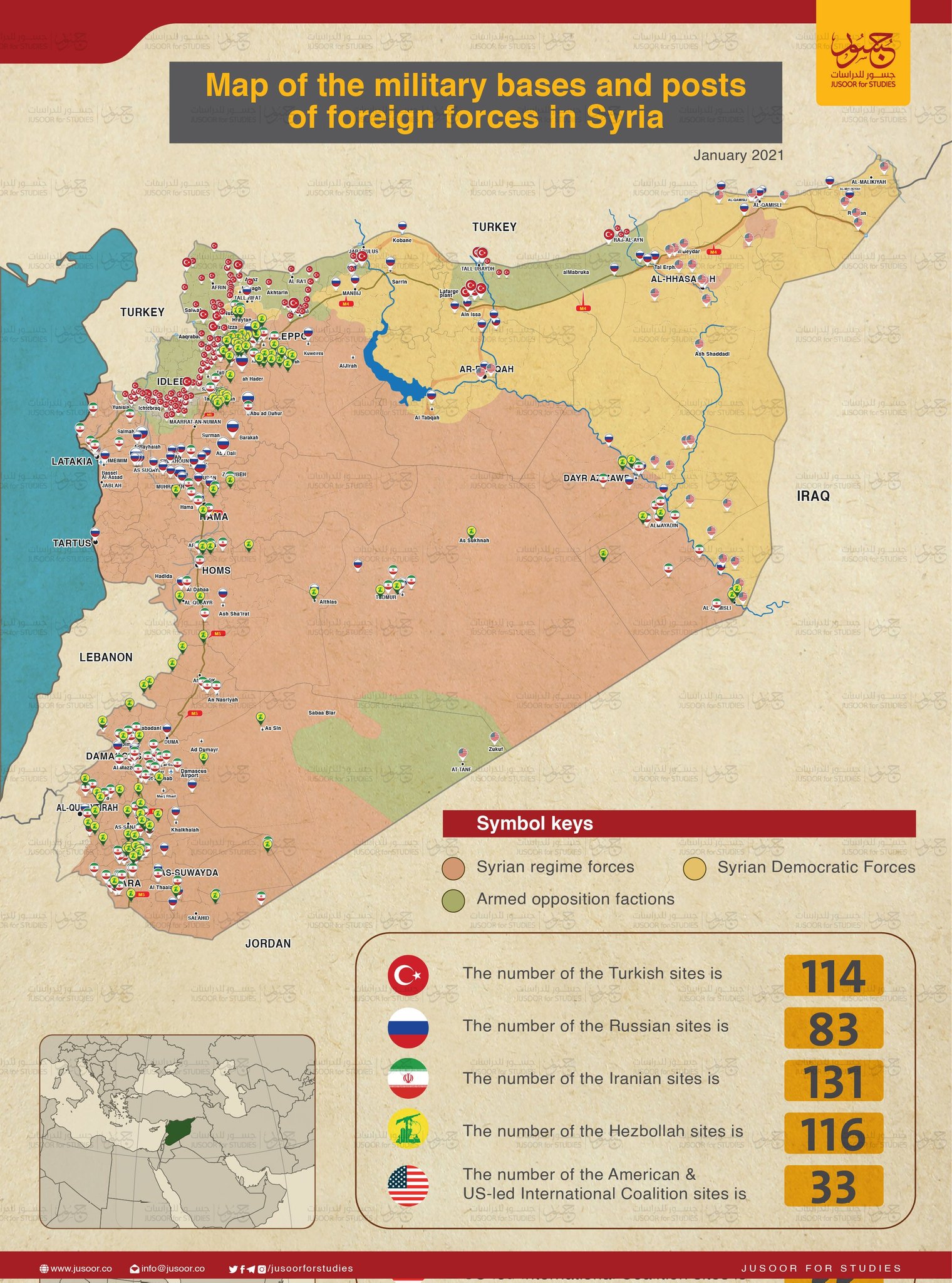 Mapa vojenských základen v Sýrii - leden 2021