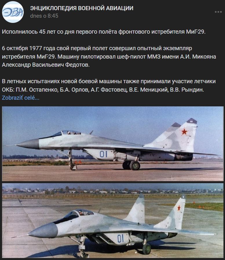 06.10.1977 = pred 45-timi rokmi prvý vzlet prototypu lietadla MiG-29 (МиГ-29). Testovací pilot Aleksandr Vasiľjevič Fedotov (Александр Васильевич Федотов). Po ukončení rozsiahleho programu letových skúšok v roku 1982 (+5 rokov) sa nové lietadlo začalo sériovo vyrábať a v roku 1987 (+10 rokov) ho oficiálne prijali VVS. Celkovo sa vyrobilo viac ako 1600 lietadiel danej rodiny ktoré slúžia v Rusku + 25 ďalších krajinách.