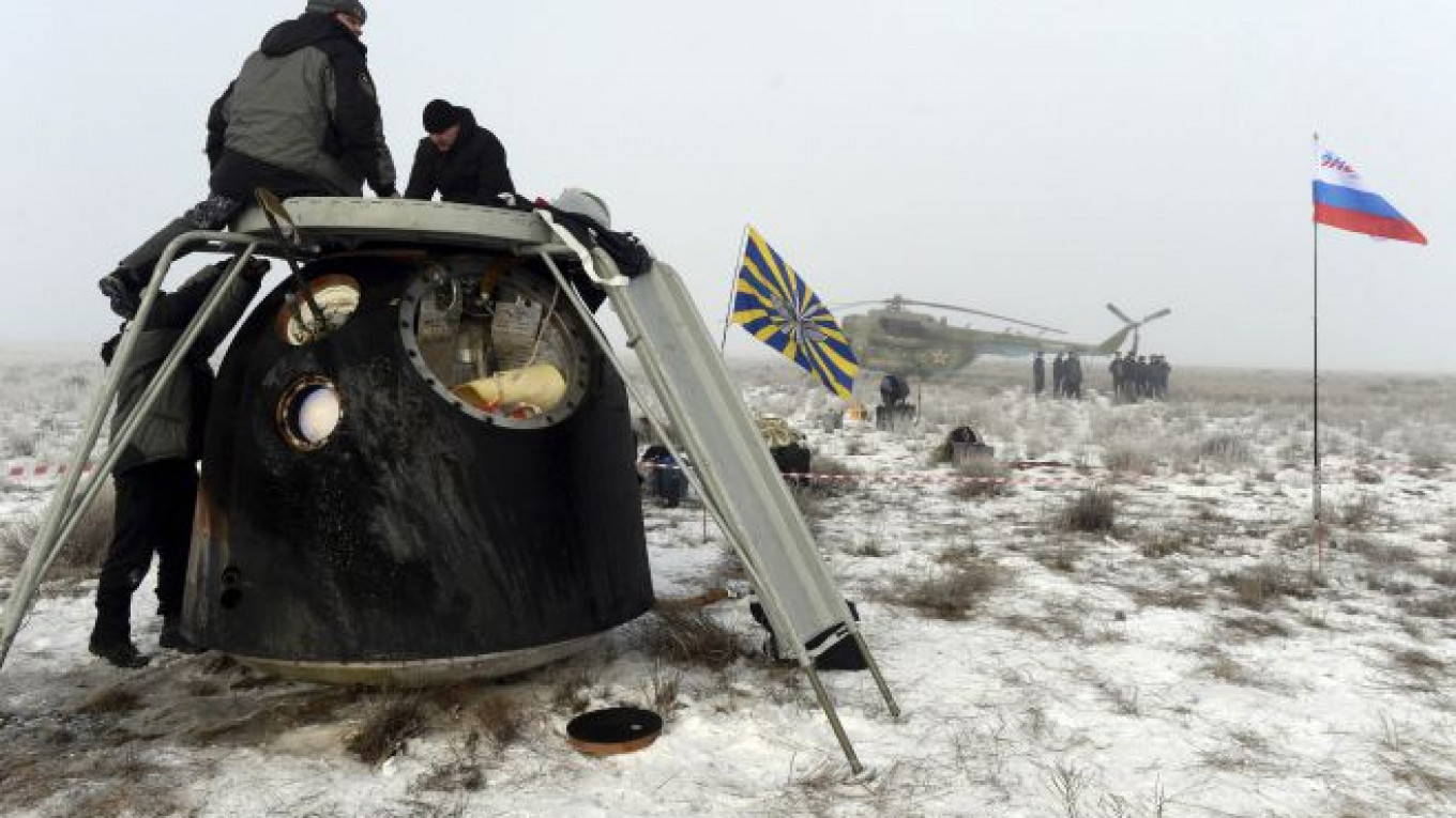 Inak rusi z nejakého dôvodu radšej vyťahujú kozmonautov z ležiacej návratovej kabíny. Do zvislej polohy ju obrátia až po vyprostení posádky.