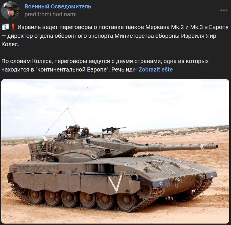 Izrael rokuje o dodávkach tankov Merkava Mk.2 a Mk.3 do Európy - Yair Koles, riaditeľ odboru obranného exportu na izraelskom ministerstve obrany. Podľa Kolesa prebiehajú rozhovory s 2 krajinami, z ktorých jedna sa nachádza v "kontinentálnej Európe". Ide o možné dodávky tankov, ktoré už boli vyradené z výzbroje IDF po prijatí nových modifikácií Merkavy. Mnohí toto vyhlásenie interpretujú ako predohru k prvému výskytu izraelských tankov na Ukrajine, ale v tom istom rozhovore Yair Koles jasne uvádza, že izraelské ministerstvo obrany zakázalo vývoz zbraní na Ukrajinu aj napriek rastúcej nespokojnosti s obranným priemyslom.
