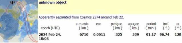 Objekt se oddělil od ruského vojenského satelitu Kosmos-2574 a sestoupil na oběžnou dráhu o 10 km níže.