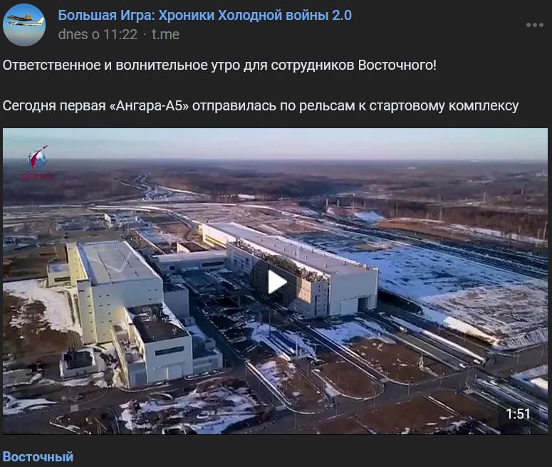 V utorok 26.03.2024 ráno sa po koľajniciach na štartovaciu rampu vo Vostočnom vydala prvá raketa Angara-A5 (Ангара-А5) Video https://vk.com/video-104764077_456283872 dĺžka 1:51 min.