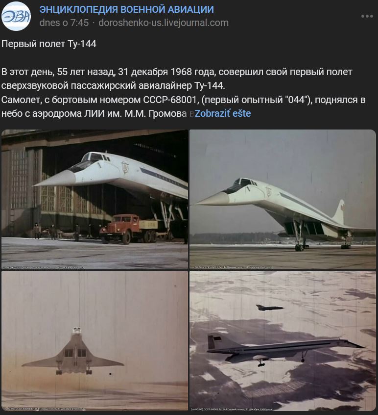 31.12.1968 = pred 55 rokmi prvý let nadzvukového dopravného lietadla Tupolev Tu-144, trupové číslo СССР-68001, letisko Žukovsky pri Moskve. Let trval 37-38 minút. Vo vzduchu za letu Tupolev Tu-144 sprevádzal jeho "analóg" MiG-21I (МИГ-21И (А-144)) a lietadlo Tupolev Tu-124 ŽLIiDB (Ту-124 ЖЛИиДБ) z ktorého prebiehalo fotenie a filmovanie. Počas svojej prevádzky lietadlo prepravilo 3284 cestujúcich. Celkovo bolo vyrobených 16 exemplárov lietadla. V roku 1999 sa uskutočnil posledný let Tu-144. Počas svojej prevádzky sa prvému nadzvukovému dopravnému lietadlu podarilo vytvoriť 13 svetových rekordov.