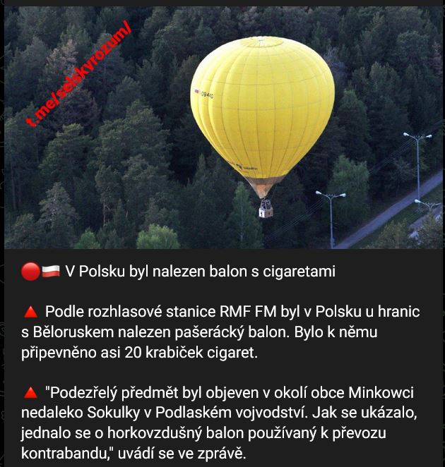 Podle rozhlasové stanice RMF FM byl v Polsku u hranic s Běloruskem nalezen pašerácký balon. Bylo k němu připevněno asi 20 krabiček cigaret. "Podezřelý předmět byl objeven v okolí obce Minkowci nedaleko Sokulky v Podlaském vojvodství. Jak se ukázalo, jednalo se o horkovzdušný balon používaný k převozu kontrabandu," uvádí se ve zprávě.